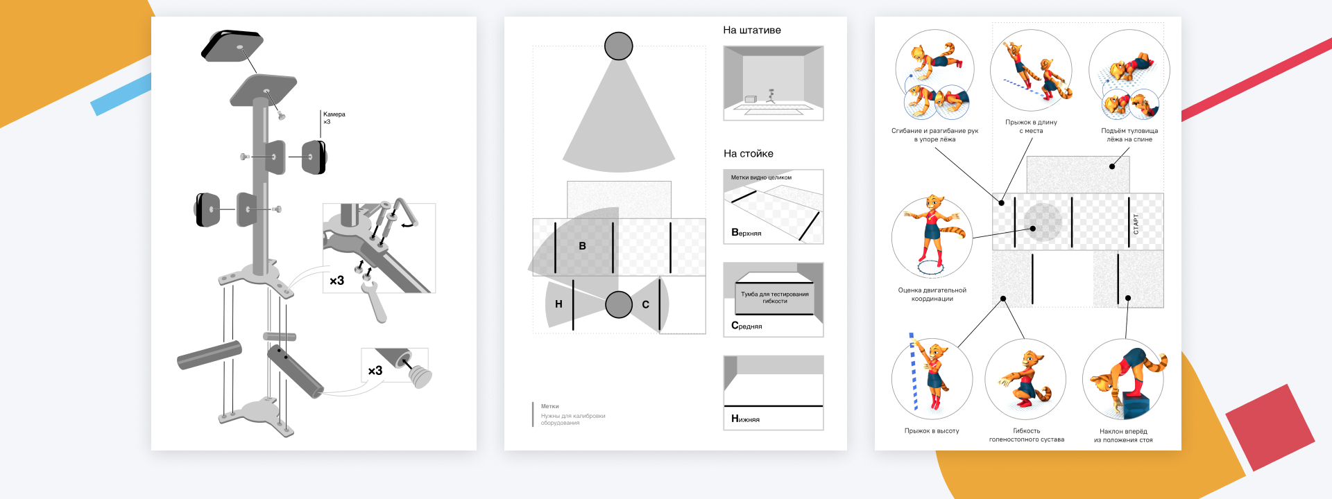 Положение ребёнка на тестировочной площадке отслеживается компьютерным зрением на базе нескольких видеокамер и камеры глубины. Для фиксации результата используются три веб-камеры, направленные в разные точки площадки. Каждая камера снимает свою часть площадки, где выполняются определённые упражнения.